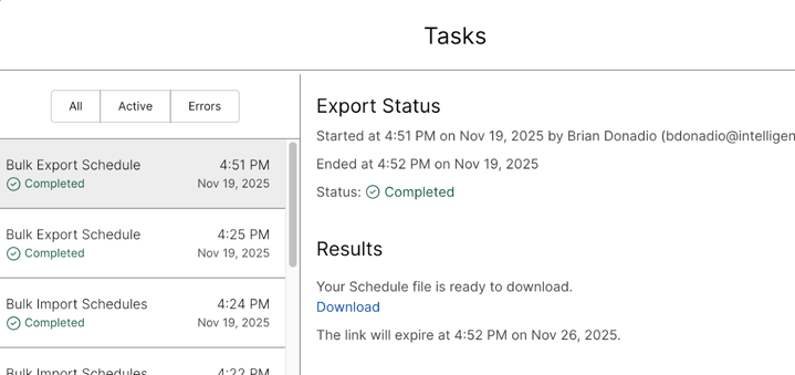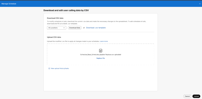 - Congrats! You have updated your schedules! Validate things went ok by spot checking in schedules under specific Location>Schedules in the gui or export the schedules in CSV to review in bulk.